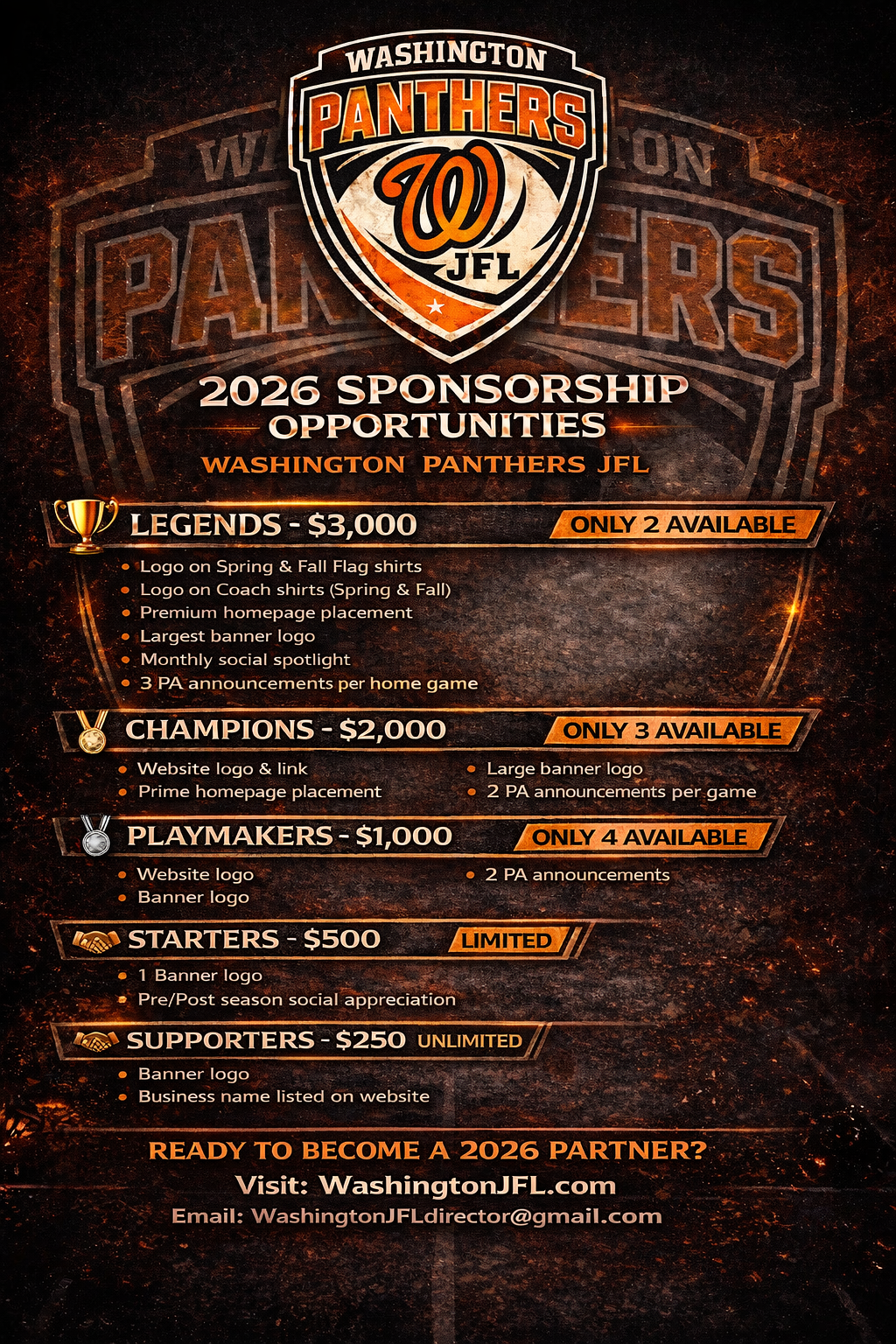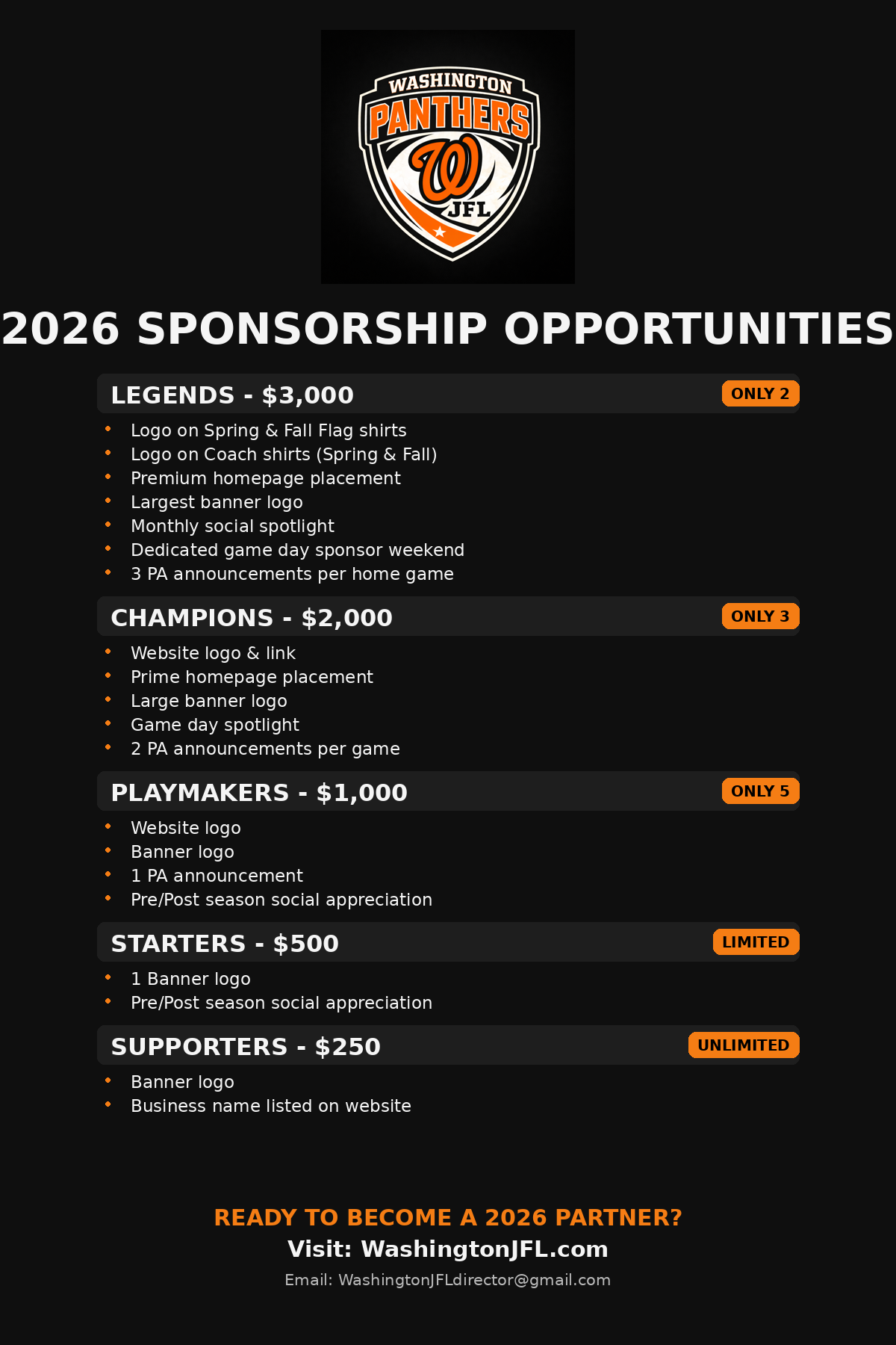 Here, you'll find direct links and access to the amazing companies and individuals who make Washington JFL possible. Their generous support helps us provide the best experience for our young athletes, and we are incredibly grateful for their contributions.